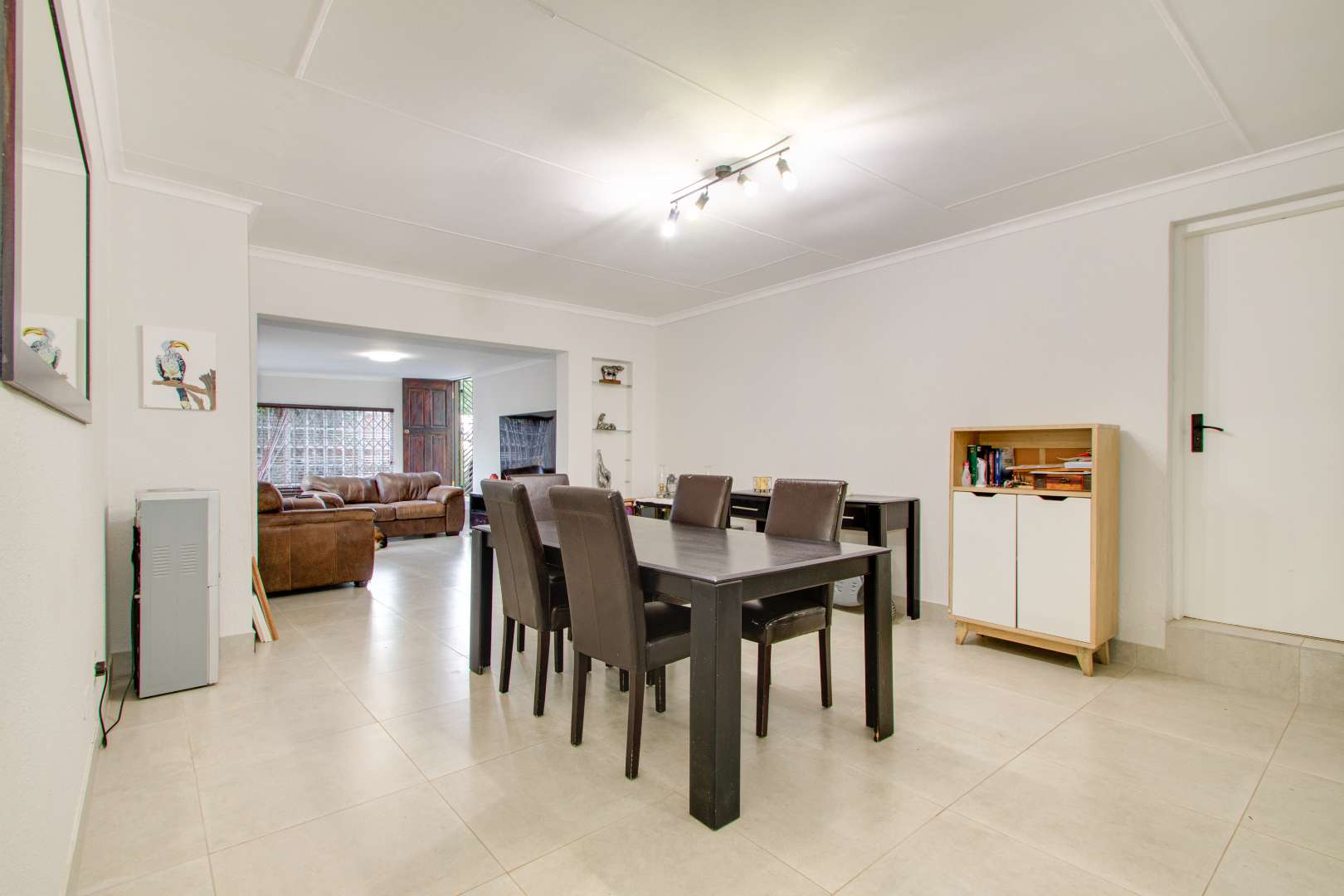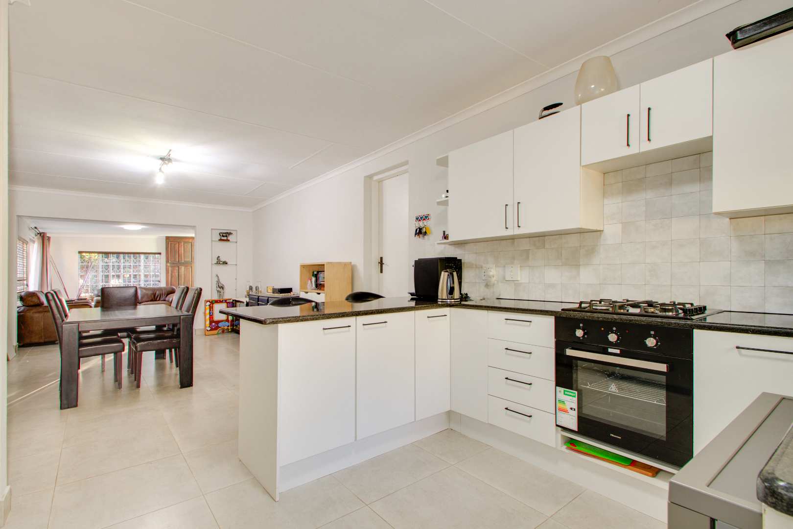 The fully tiled spacious dining room and lounge area lead off from the open-plan kitchen.