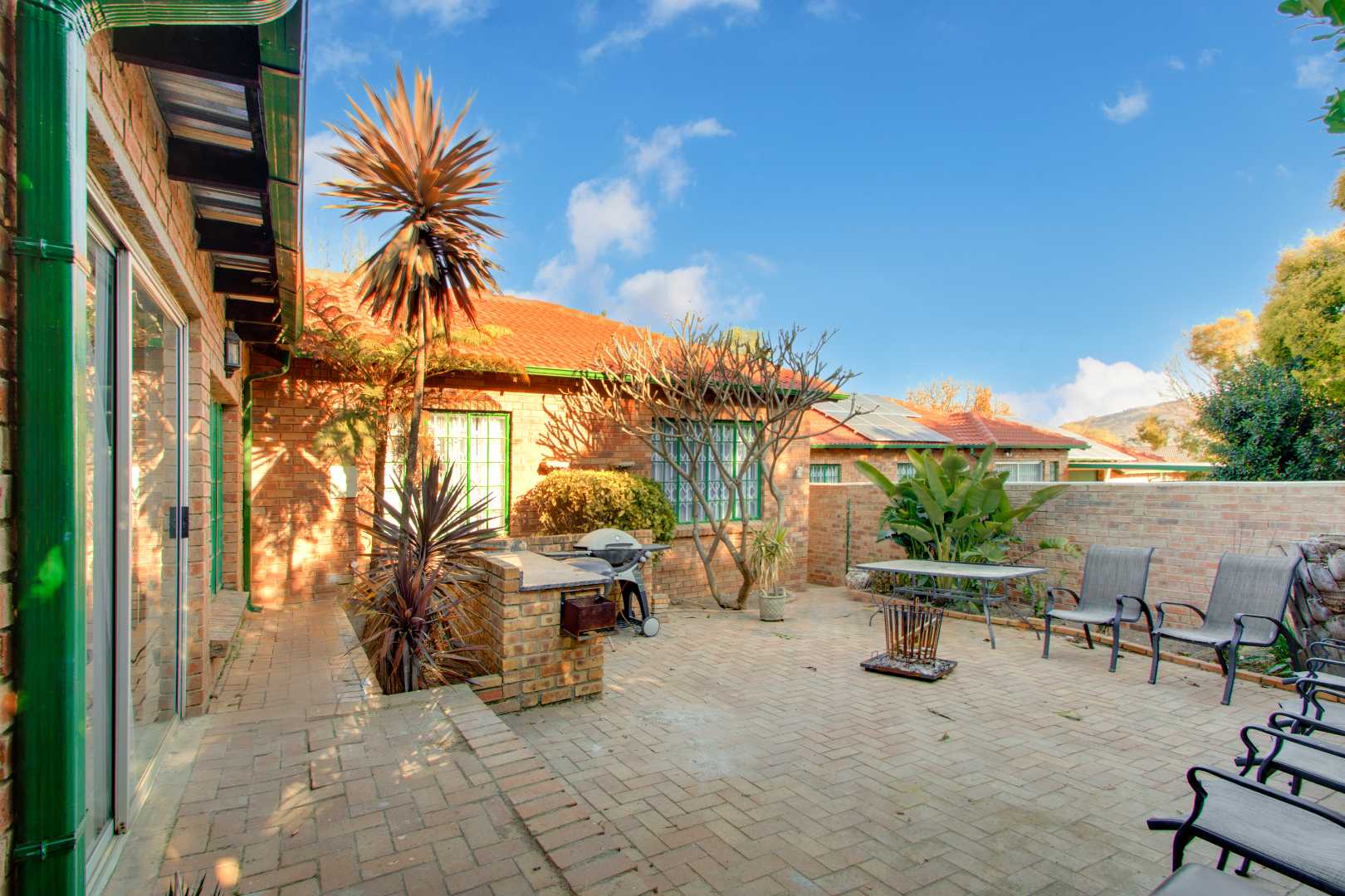 Sliding doors from the lounge open out onto a paved patio area, ideal for entertaining.